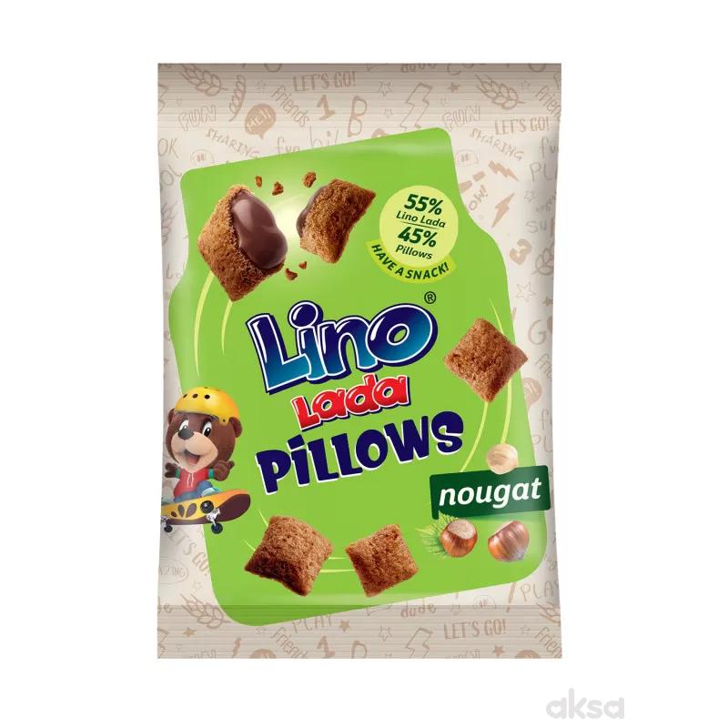 Lino lada pillows nougat su hrskavi jastučići punjeni Lino ladom nougat. Sadrže 55% Lino lade i 45% žitarica, što im daje vrhunski puni ukus Lino lade nougat u savršeno hrskavom pillows omotaču.