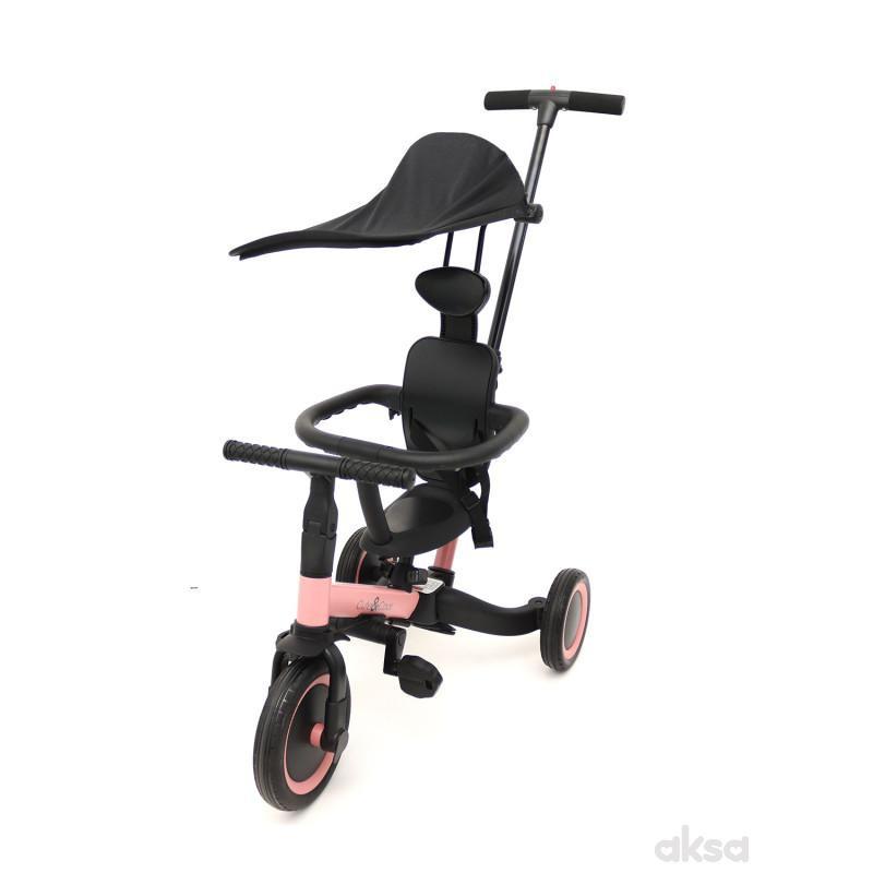 Dizajniran sa udobnim sedištem, sigurnosnim pojasevima i sklopivom nadstrešnicom za zaštitu od sunca, ovaj tricikl pruža maksimalnu sigurnost i komfor. Lagana, ali čvrsta konstrukcija omogućava lako sklapanje i nošenje.