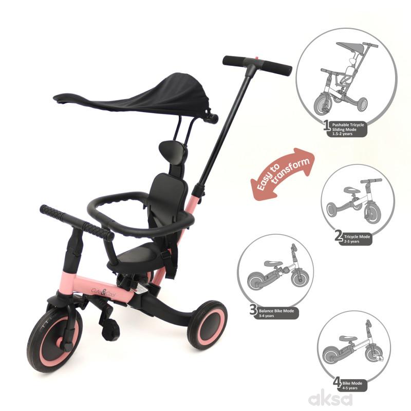3. Balans bicikl (3-4 godine) – Uklanjanjem pedala i spajanjem zadnjih točkova, tricikl se lako pretvara u balans bicikl koji pomaže u razvoju koordinacije i ravnoteže.
