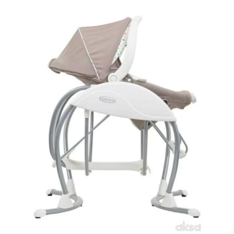 Graco ljuljaška Glider Elite Scatter Geo namenjena je deci od rođenja do 9 meseci. Poseduje udobno, prostrano sedište sa 3 položaja naslona. Ljuljaška se može podesiti u 6 različitih brzina ljuljanja i 2 umirujuće vibracije, a tokom ljuljanja vašem detetu možete pustiti neku od 5 različitih prirodnih zvukova i 10 melodija za potpuno uživanje. Kada se ljuljaška skine sa baze može se koristiti kao kompaktna i prenosiva ležaljka. Ljuljaška poseduje sigurnosni sistem u 5 tačaka vezivanja. Navlaka se može skinuti i prati u veš mašini.