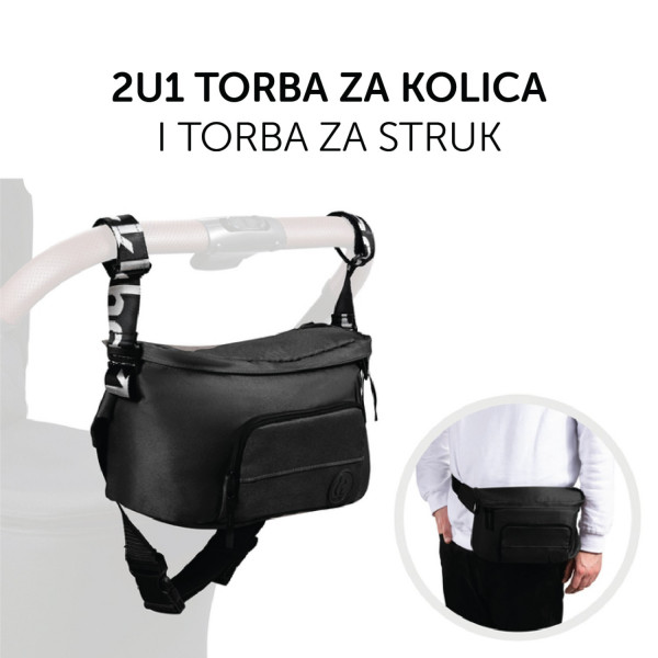 Ova torba je neophodna ako često putujete sa kolicima. Držite sve važne stvari u ovoj torbi, koju možete pričvrstiti za kolica ili nositi oko struka. Pruža prostor za odlaganje stvari za bebu koje treba držati pri ruci, kao što su flašice, dude i pelene. Sa prednjim džepom za telefon i skrivenim unutrašnjim džepom za ključeve.
